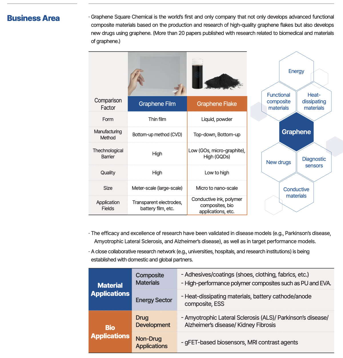 Graphene Square Chemical has technology to mass-produce various graphene chemical materials such as graphene plate nanoplatelets (1 to 6 micrometers), graphene oxide (1 to less than 1 micrometer), and graphene quantum dots (10 nanometers or less).